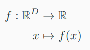 to specify a function. Here \( R^{D} \) is the domain (정의역) , \( f \) and the function values \( f \) are the image/codomain(공역) of \( f \).