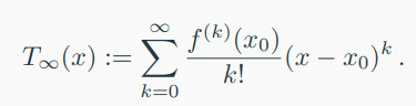 -> For \(x_{0}\), we obtain the Maclaurin series as a special instance of the Taylor series. If \(f(x) = T_{\infty}(x)\) then \(f\) is called \(analytic\).