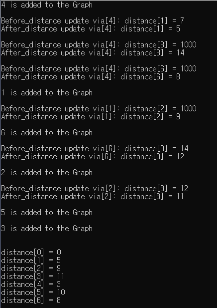 printf("After_distance update via[%d]: distance[%d] = %d\n\n", u, j, distance[j]);