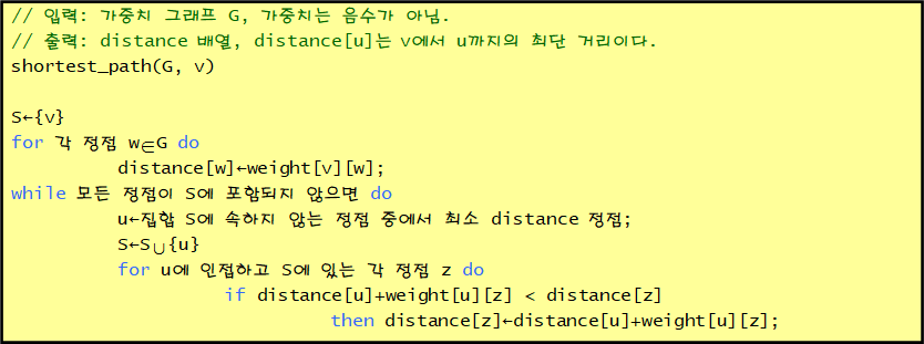 1-2) distance[w] (w는 집합 S에 포함되지 않는 vertex.): v에서 시작해서 S에 포함된 정점만 경유하여 w까지 가는 최단 경로의 길이